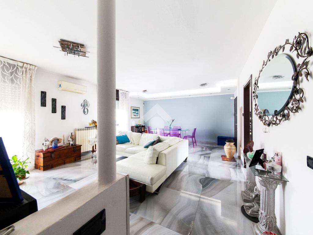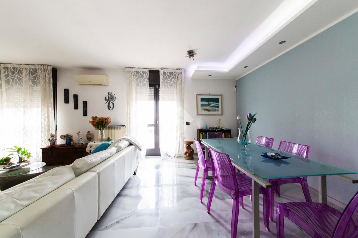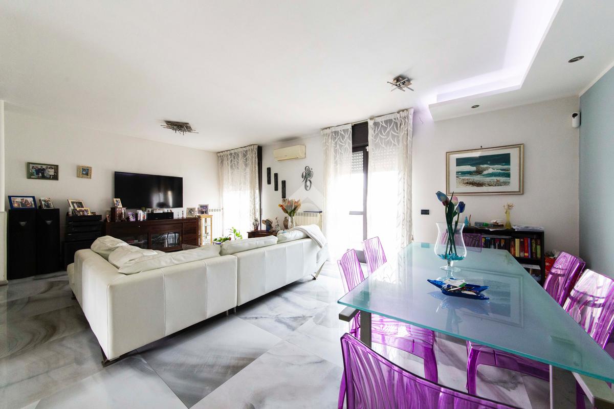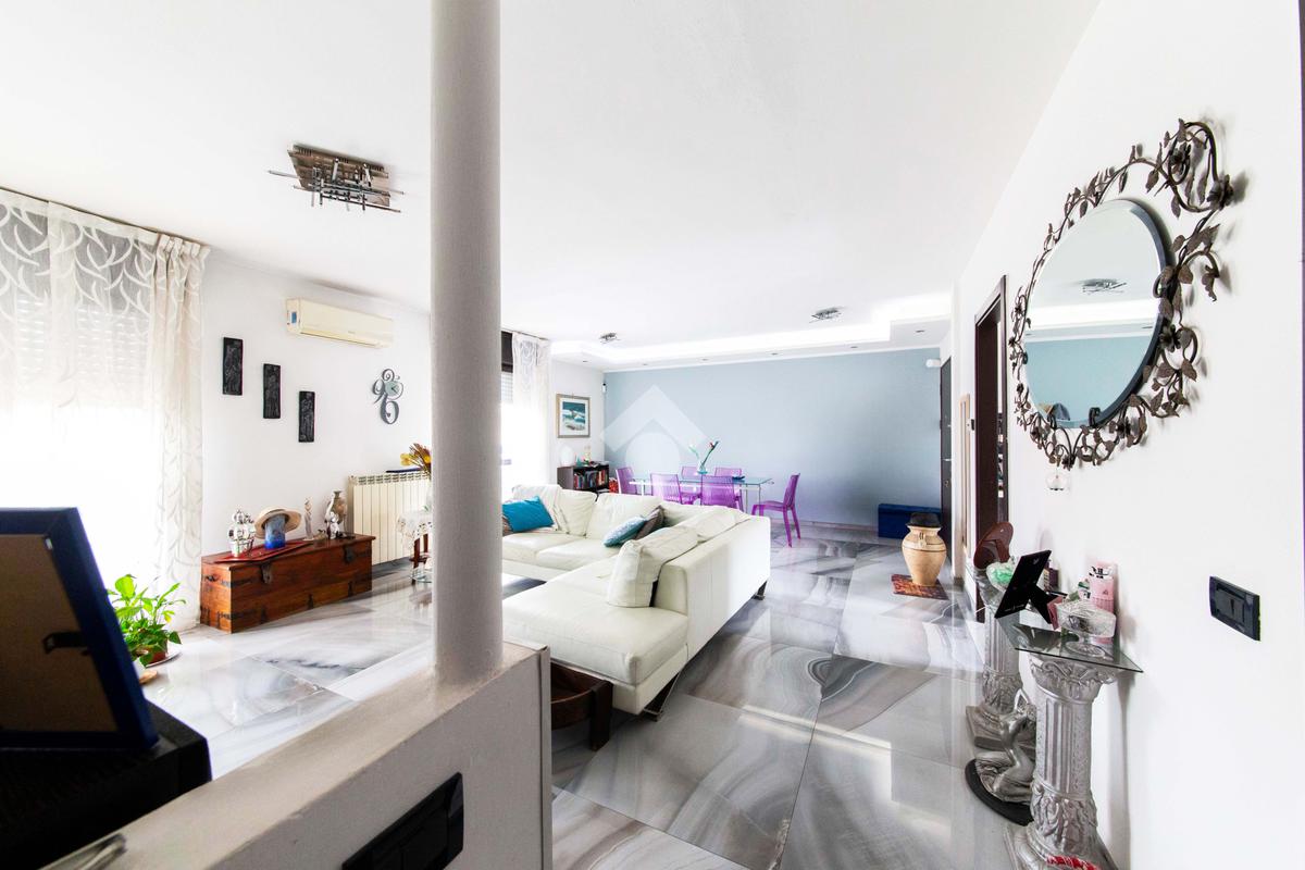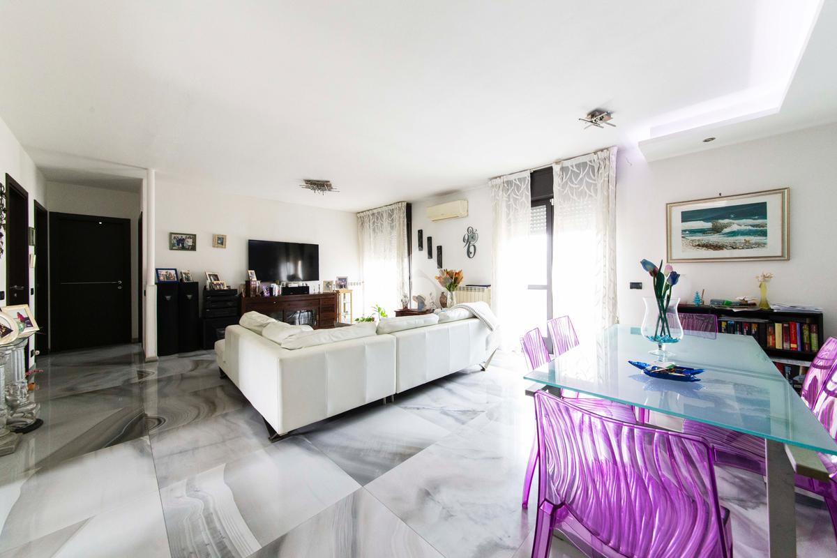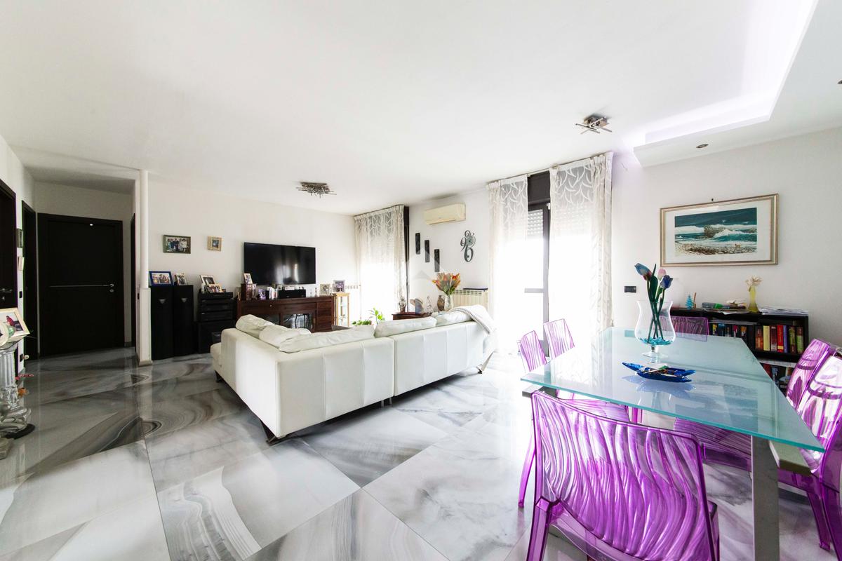 L'ingresso avviene tramite porta blindata che immette direttamente nell'ampio e luminoso soggiorno, impreziosito dalla pavimentazione in porcellana estesa in maniera uniforme lungo tutta l'abitazione, che conferisce un tocco di raffinatezza all'ambiente.