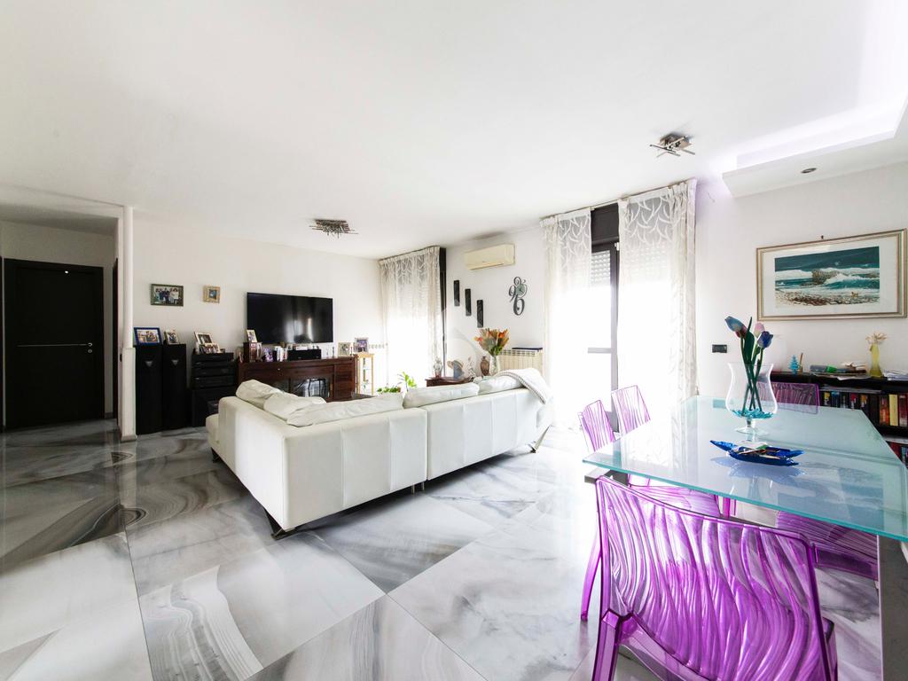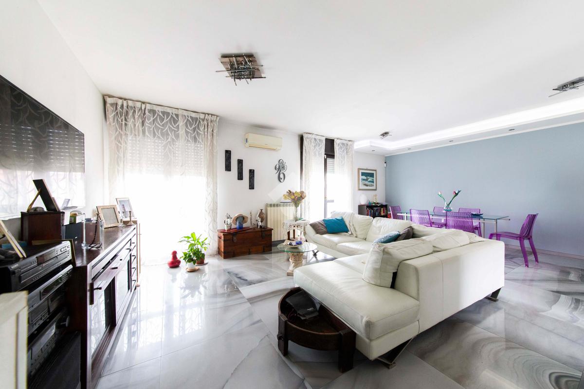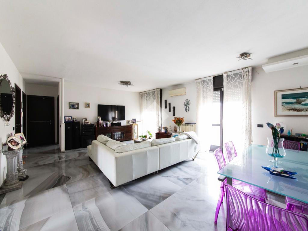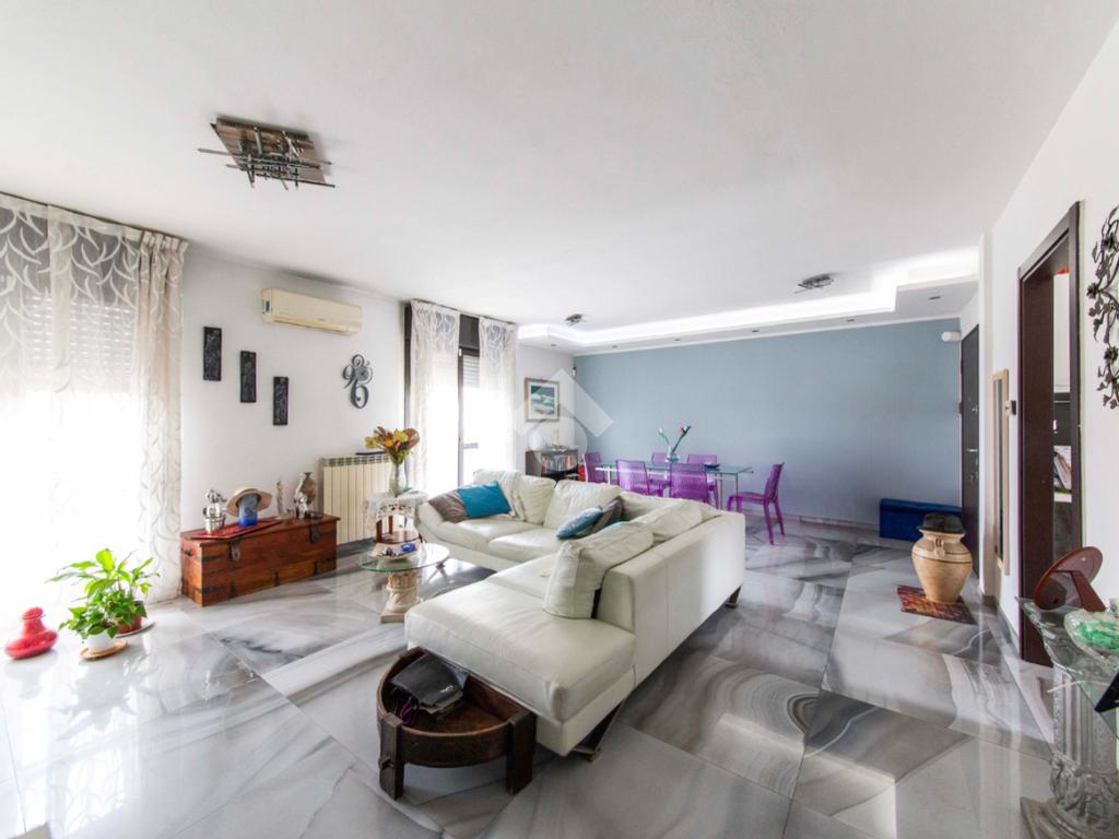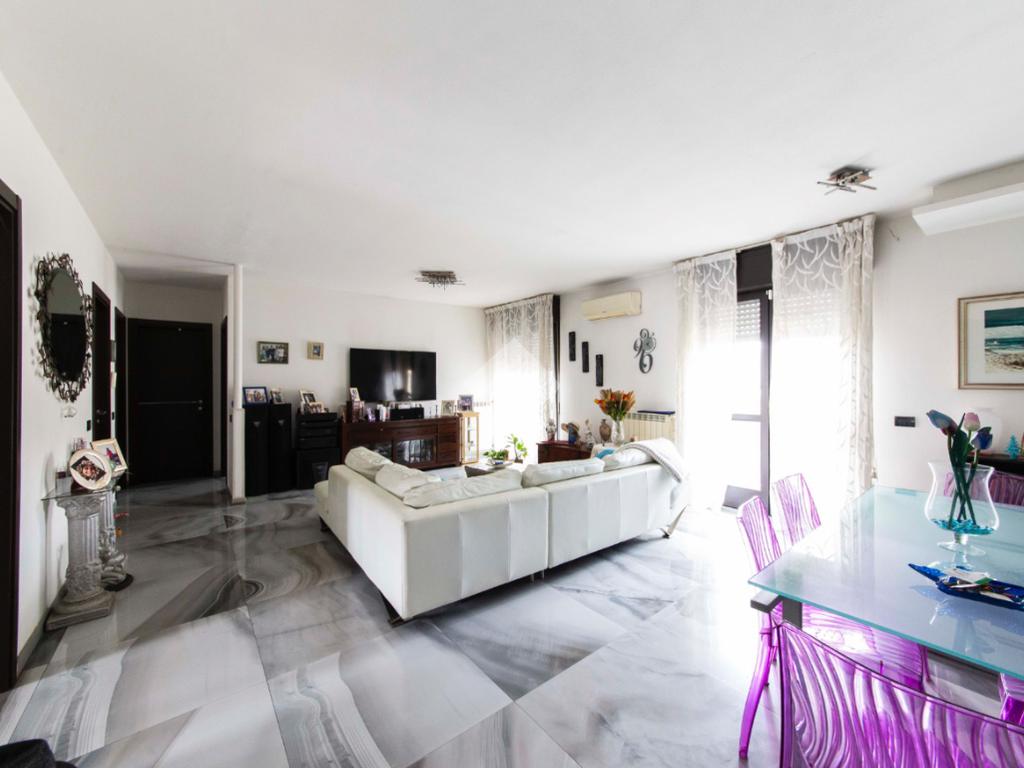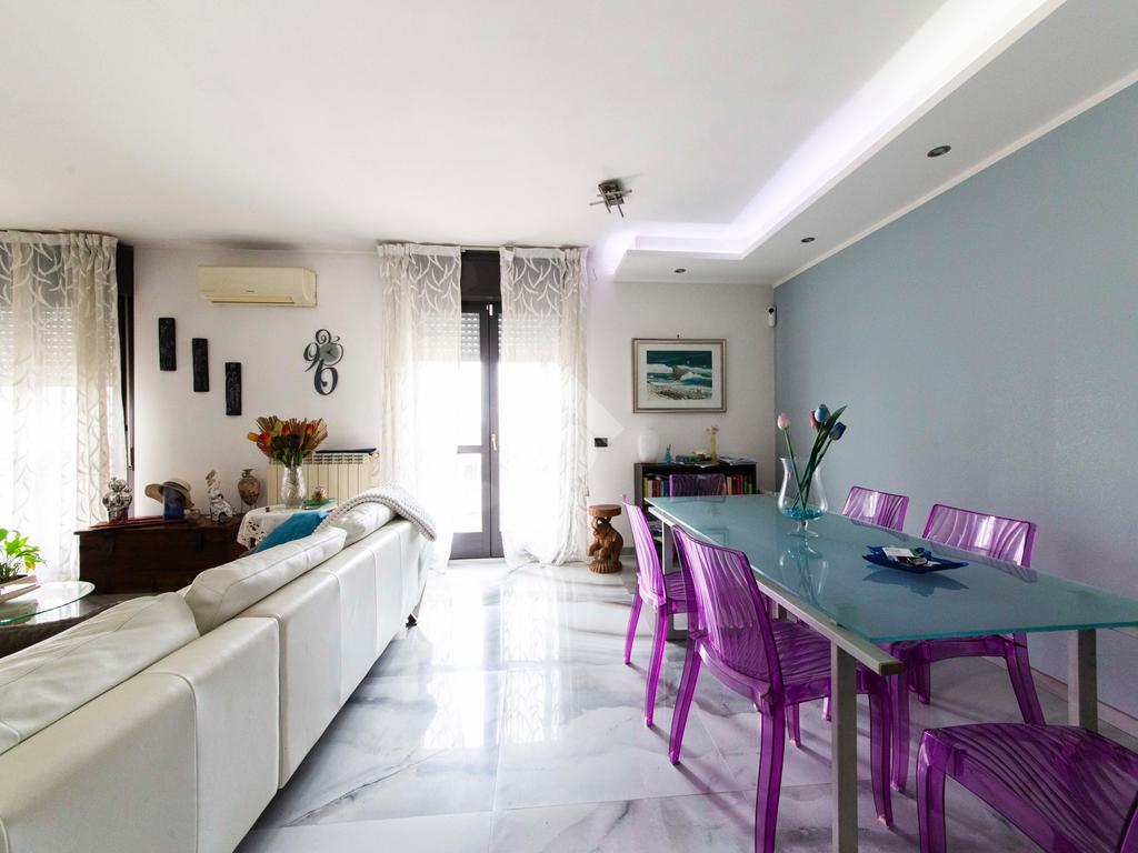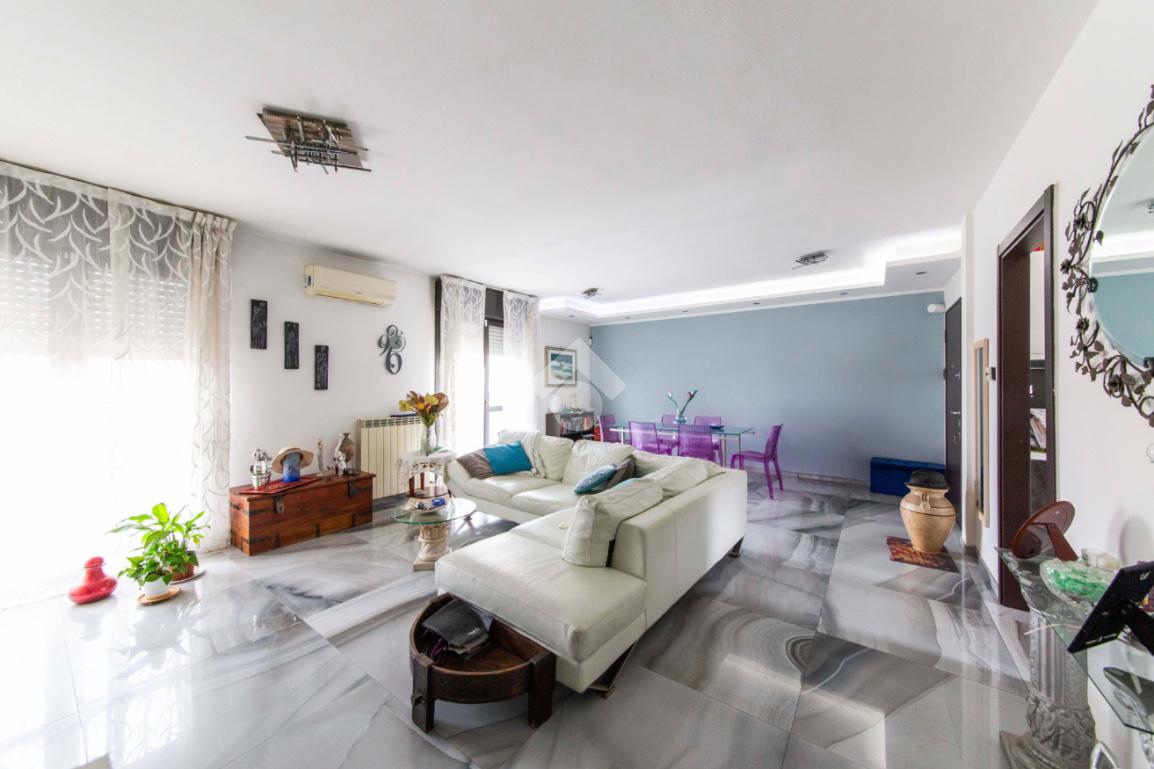 L'ingresso avviene tramite porta blindata che immette direttamente nell'ampio e luminoso soggiorno, impreziosito dalla pavimentazione in porcellana estesa in maniera uniforme lungo tutta l'abitazione, che conferisce un tocco di raffinatezza all'ambiente.