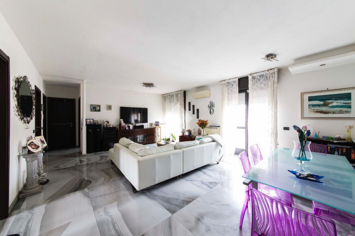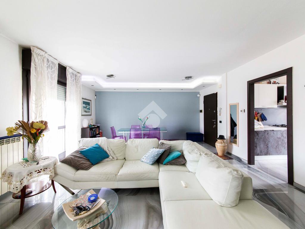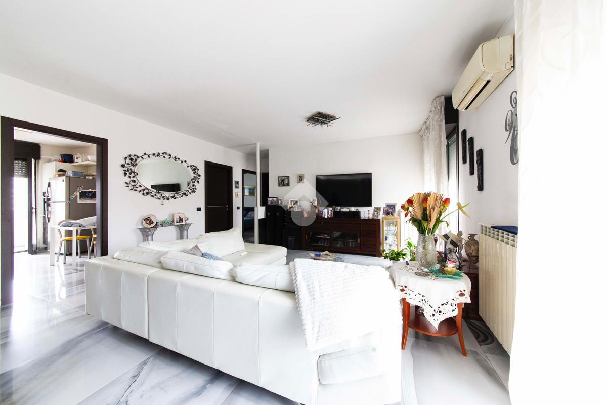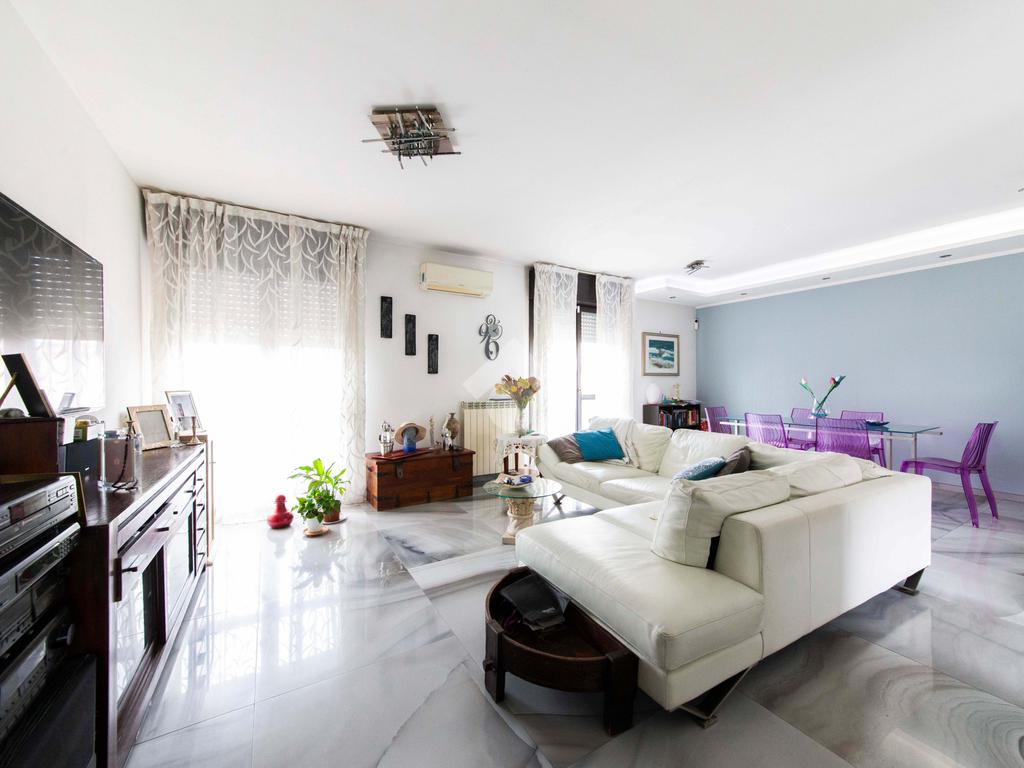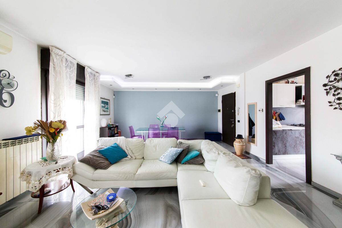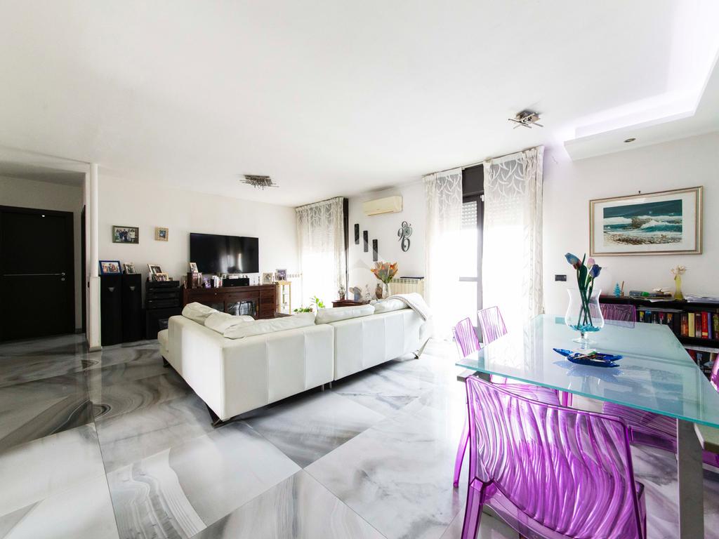 L'ingresso avviene tramite porta blindata che immette direttamente nell'ampio e luminoso soggiorno, impreziosito dalla pavimentazione in porcellana estesa in maniera uniforme lungo tutta l'abitazione, che conferisce un tocco di raffinatezza all'ambiente.