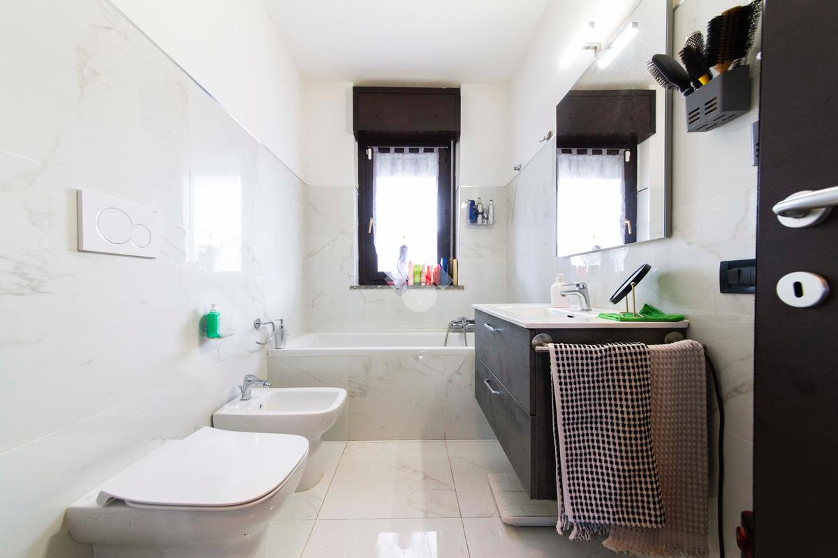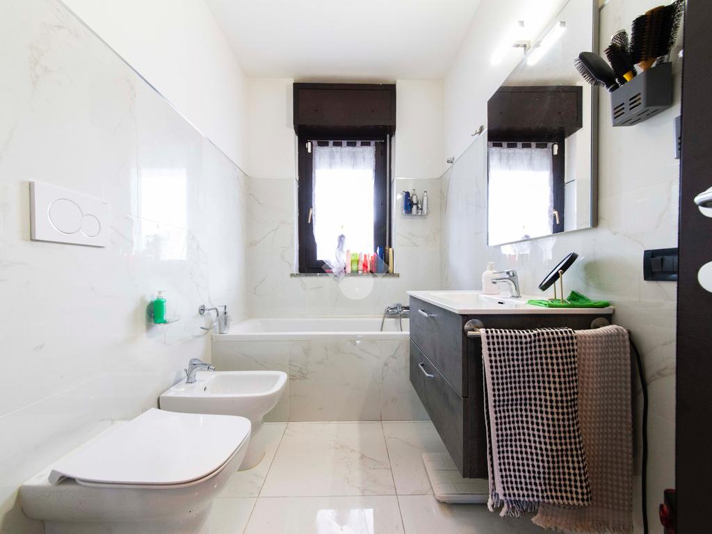Il bagno si presenta finestrato, con finiture eleganti e materiali di qualità, selezionati per creare un'atmosfera rilassante e accogliente. Le pareti sono rivestite con piastrelle in tonalità neutre, che donano luminosità e ampiezza, mentre i dettagli cromati e le linee pulite degli arredi donano un'estetica moderna e funzionale.